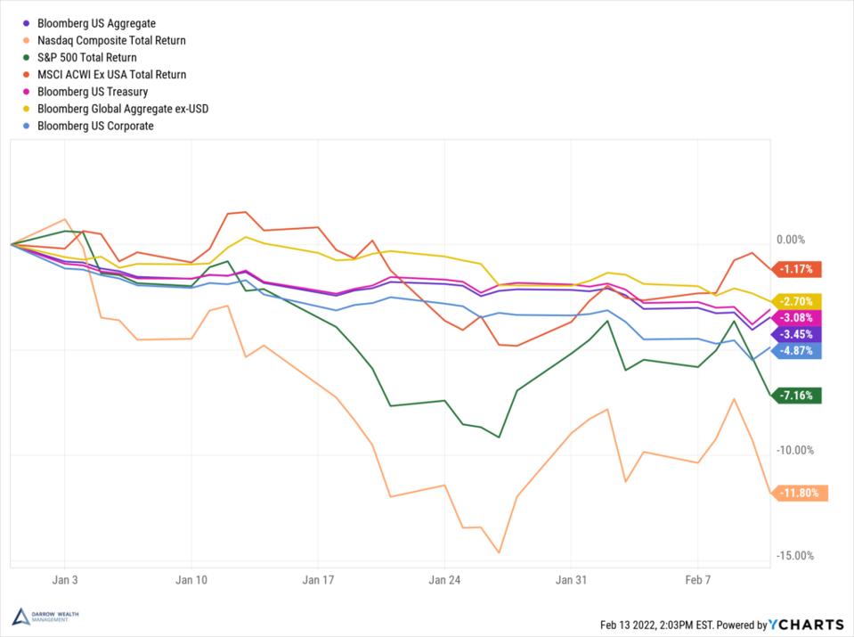 The Federal Reserve plans to end easy-money policy and raise interest rates. When interest rates rise, investors in the primary market earn higher coupons on new bond issues. This generally means outstanding bonds in the secondary market are worth less. The market has been pricing in multiple interest rate hikes all year, which is reflected in total returns, and one reason the bond market is down.
