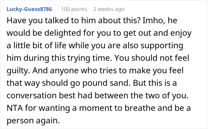 Many caregivers struggle with feelings of guilt, like this woman did. She wasn’t sure whether it would be appropriate to go to a concert for one night while her husband was still in the ICU. So, she decided to consult with the folks on the Internet.