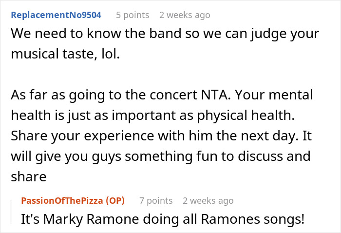 When we reached out to u/PassionOfThePizza, the author of this story, the most pressing concern was whether or not she went to the concert. “The concert is at the end of September, but I am absolutely planning on going,” the Redditor told us via a private message. “The outpouring of support from most of the commenters on Reddit helped. And, of course, I asked my husband if he minded, and he said, ‘No!'”