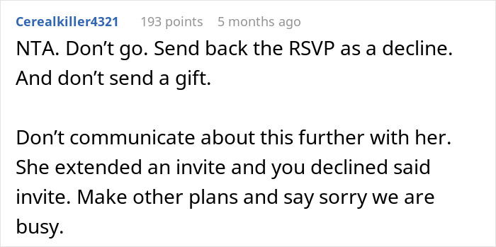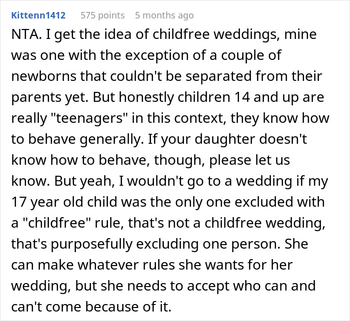The bride-to-be seemed set on her decision to exclude her niece, which likely didn’t sway the author to change her mind about not attending. Unless they were willing to reason, any conversation would’ve been futile.