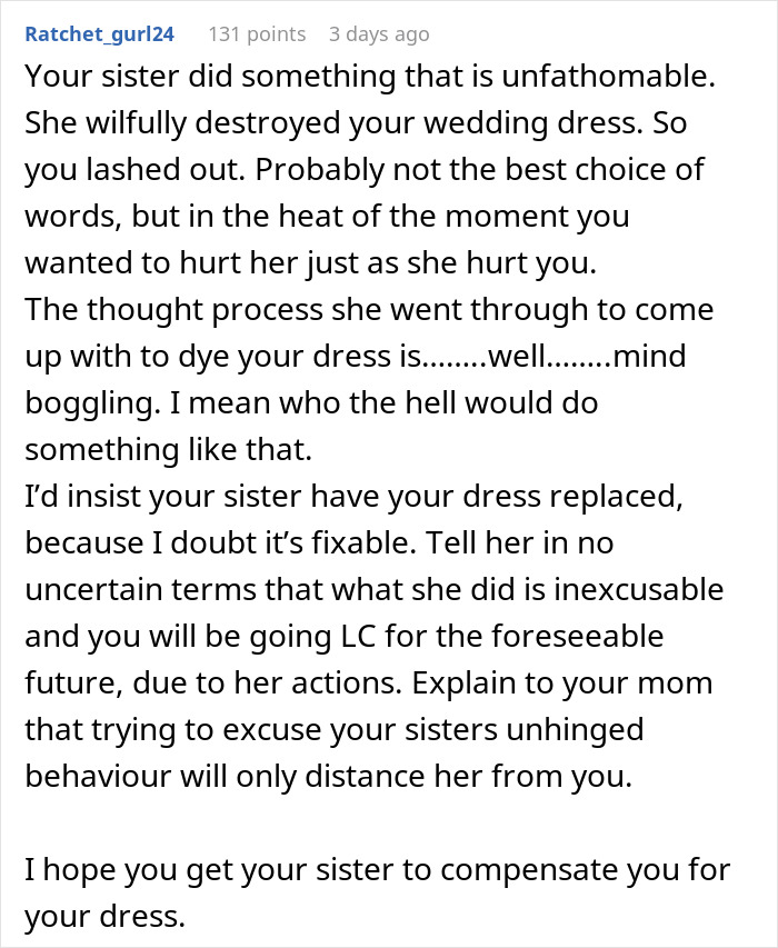 At best, the bride knows her sister is insecure and, in an attempt to inflict maximum damage, has picked a very nasty thing to say. There is an alternative possibility, that there is more going on here that is beyond the scope of this destroyed dress and she simply decided to leave it out. Many netizens sided with the bride, however a few through her words really did go too far. “Wishing” your sister’s marriage was ruined before your own wedding is not just a normal thing one says in anger. It would be tantamount to “wishing” the bride’s own wedding was ruined.