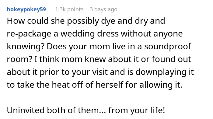 A woman discovered that her eco-conscious sister had taken the liberty to secretly tie-dye her wedding dress. She called her out and, in the ensuing argument, said some rather mean things, so she wanted to get the internet’s opinion on whether it was justified. We reached out to the bride via private message and will update the article when she gets back to us.