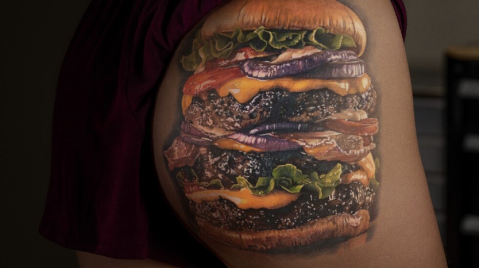 But there’s a catch on the backside: The winner, in order to get the burgers, must also get a giant tattoo of a cheeseburger on their butt.