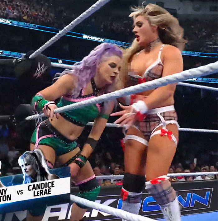Tiffany, whose real name is Jessica Woynilko, was facing Candice LeRae on Friday (February 21) when she experienced a wardrobe malfunction that was censored with a blackout screen.