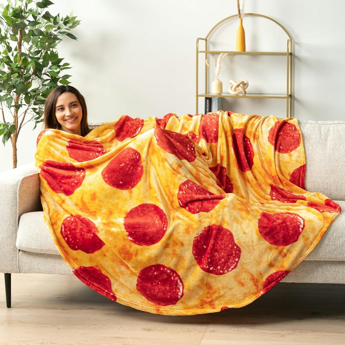 Amazon -This double-sided pepperoni pizza blanket is made of premium fleece that’ll keep you both warm and mildly entertained. With a luxuriously silky-smooth texture, the round blanket has a generous 70-inch diameter and features a vibrant colored pepperoni and cheese print. It’s also available in a tortilla print, if you fancy yourself more of a burrito person.