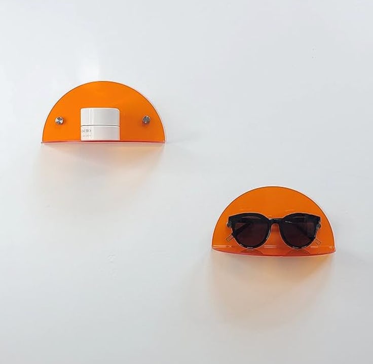 Inject a bright pop of color into your space with this pair of orange floating shelves. They are constructed from high-quality acrylic and feature a minimalist semi-circle design. The 8-inch shelves can be wiped down with a damp cloth for a quick clean, and they include all necessary mounting hardware for simple installation.