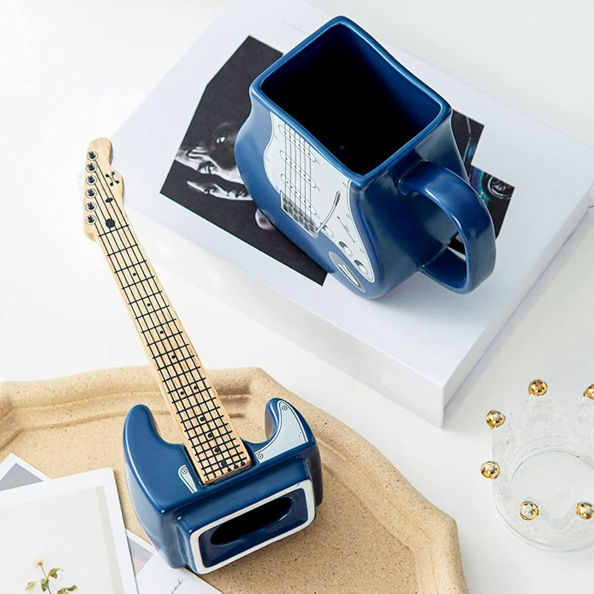 This electric guitar-shaped ceramic mug has a lidded design to keep beverages warm and a 15-ounce capacity. The unglazed nonslip bottom ensures stability, while the attached handle provides a comfortable grip. The mug’s vibrant colors are fade-resistant, and the surface is scratch and corrosion-resistant for durability. You can also buy it in red or several other designs.