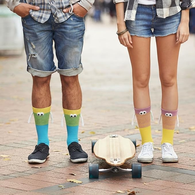 Add a playful element to your outfit with these funny holding hands socks. The purchase includes two pairs of socks, which are made of high-quality 100% cotton. The sock fronts feature hand-stitched 3D googly eyes, while the sides have sewn-in arms with built-in magnets. They have a stretchy elastic fit for comfort and should be hand-washed for best results.