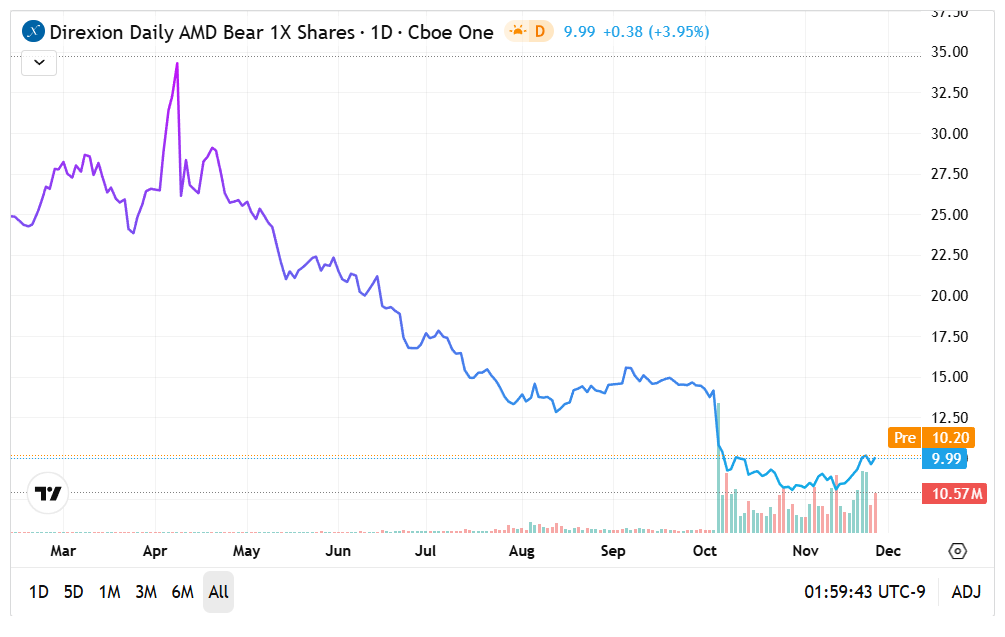 The AMDD ETF: From the January opener, the AMDD ETF has been ugly, losing nearly 60%. That said, in the past month, the bear fund is up over 22%.