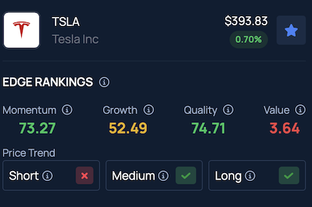 Benzinga's Edge Stock Rankings show that although Tesla's short-term price trend has slowed, the company continues to demonstrate strong medium and long-term growth potential. Click here to see how it stacks up against its peers.
