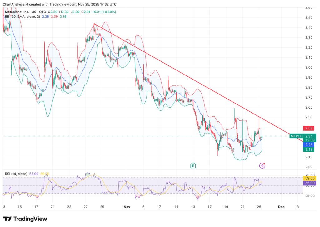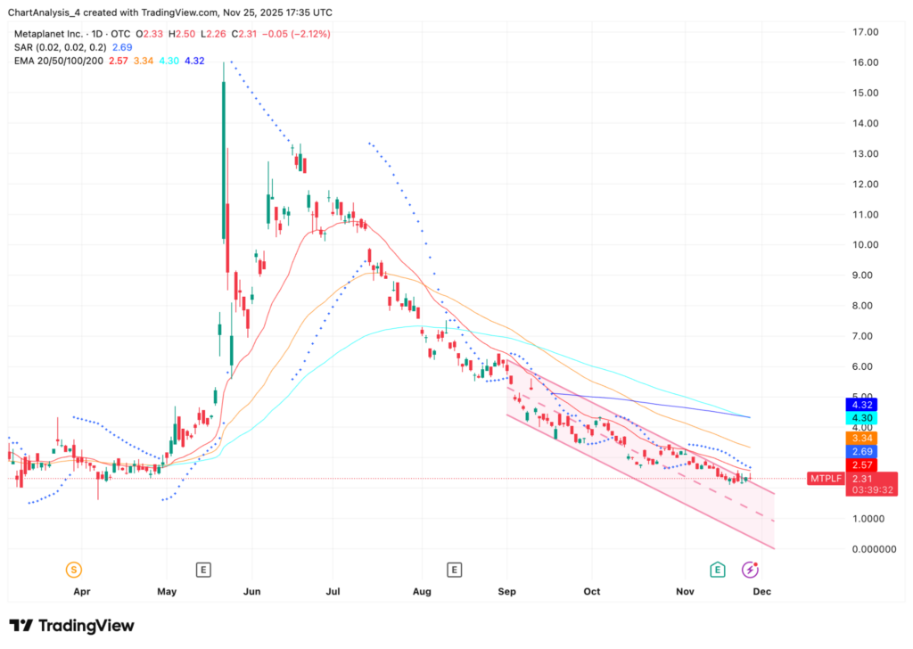 Metaplanet trades near $2.31 and remains inside a clear downtrend channel that has guided every lower high and lower low since June.