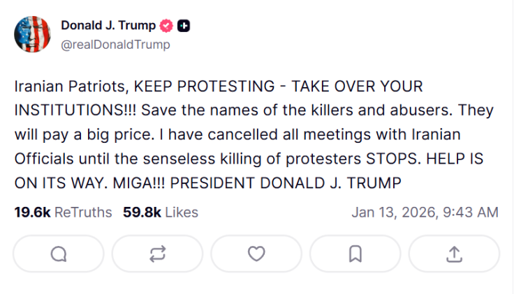 President Donald Trump publicly encouraged Iranians on social media to continue protesting, posting on Truth Social that "HELP IS ON ITS WAY," and to "Save the names of the killers and the abusers," as "They will pay a big price." while declining to explain what that meant when pressed by reporters. Trump also said he had halted meetings with Iranian officials until violence against protesters stopped.