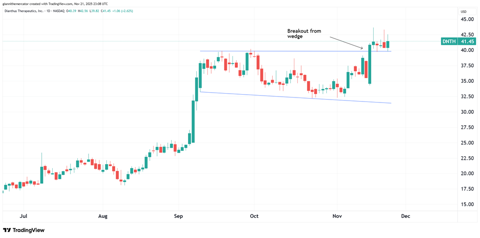 • From a technical standpoint, DNTH just broke out from a wedge pattern, which points to a big acceleration in upside momentum.