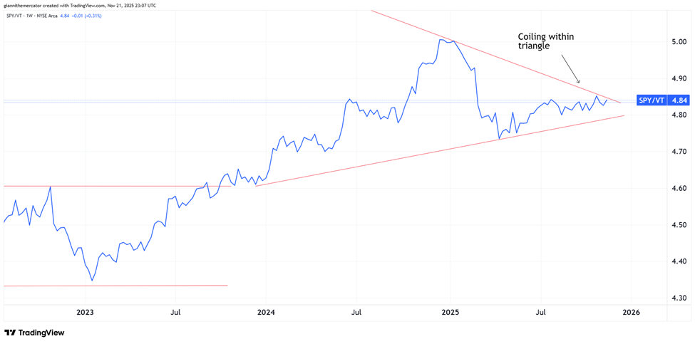I'm looking at the ratio here between the S&P 500 (SPY) and a total world stock fund (VT). The ratio here is in a broader uptrend, but over the past couple of years, we've seen it consolidate into a symmetrical triangle formation.