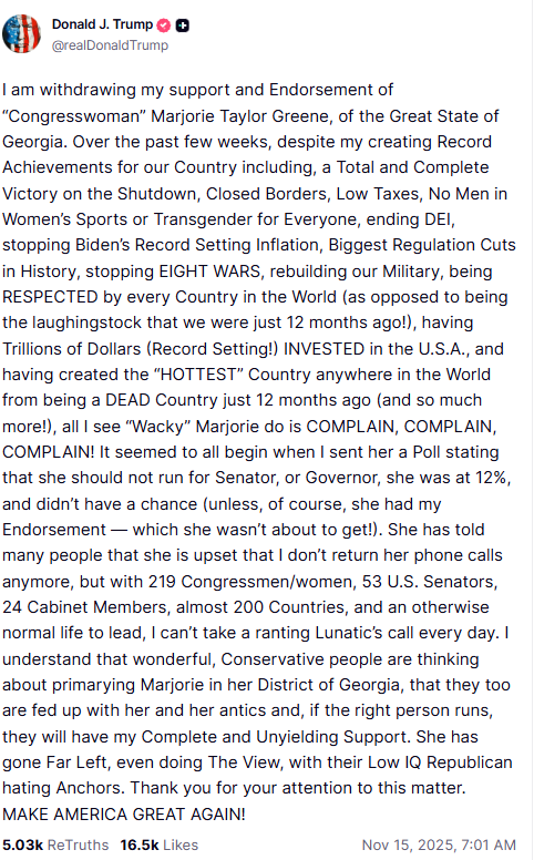 According to a Truth Social post late Friday, President Trump said tensions began when he advised Greene against running for Senate or governor, citing polls showing her support at 12%. He added that Greene grew upset after he stopped returning her calls.