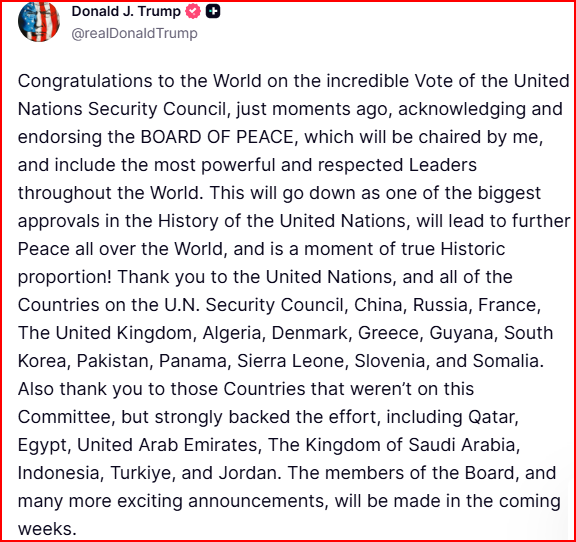 The resolution, drafted by the U.S., was approved by the Security Council on Monday. It endorses Trump’s 20-point ceasefire plan, which was unveiled in September.