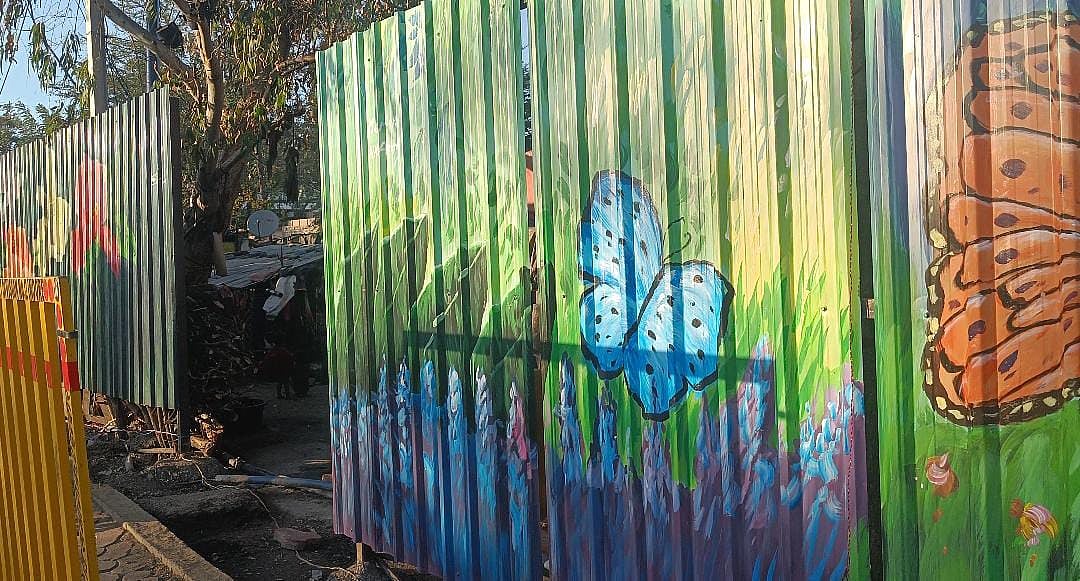 जैसा कि हमने पहले ज़िक्र किया कि एयरपोर्ट से शहर के इस रास्ते पर एक बस्ती भी पड़ती है. जिसे पूरी तरह से टीन के बोर्डों पर बनी खूबसूरत पेंटिंग से ढक दिया गया है.