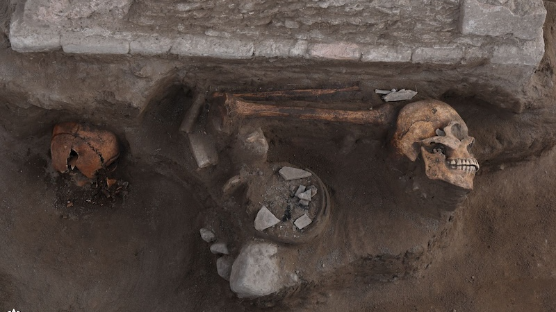 One of the skulls appears to still be attached to part of the spine, suggesting decapitation was part of the sacrificial ritual.