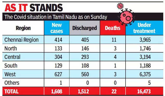 CHENNAI: TN reported 1,608 fresh cases of Covid-19 on Sunday, a drop after four days, and 22 more deaths. The state’s case tally is now 26.33 lakh and death toll 35,168 -- third highest in the country after Maharashtra (1,38,142) and Karnataka (37,504).