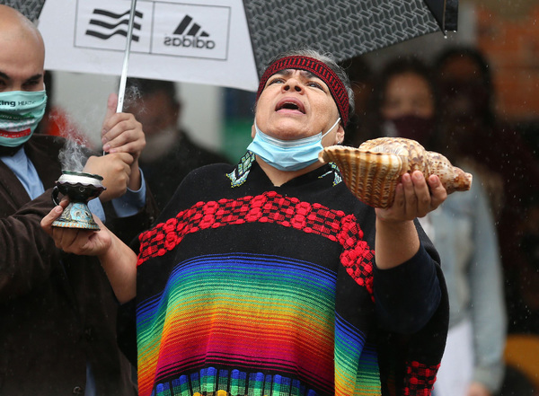CHICAGO _ Amid scattered storms, a woman wearing a traditional poncho led a ceremony Monday at Pilsen's Plaza Tenochtitlan to pay respect to the contributions of Indigenous people.