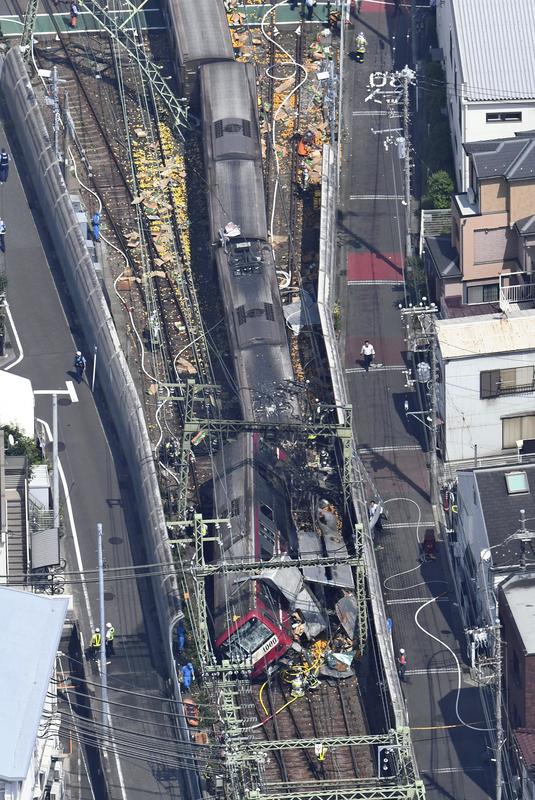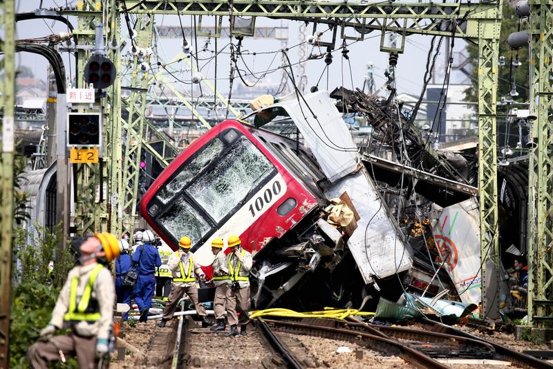 YOKOHAMA -- One person was killed and at least 30 injured when the first three cars of an express train on the Keikyu Line derailed after the train collided with a truck at a crossing in Kanagawa Ward, Yokohama, at around 11:40 a.m. Thursday.