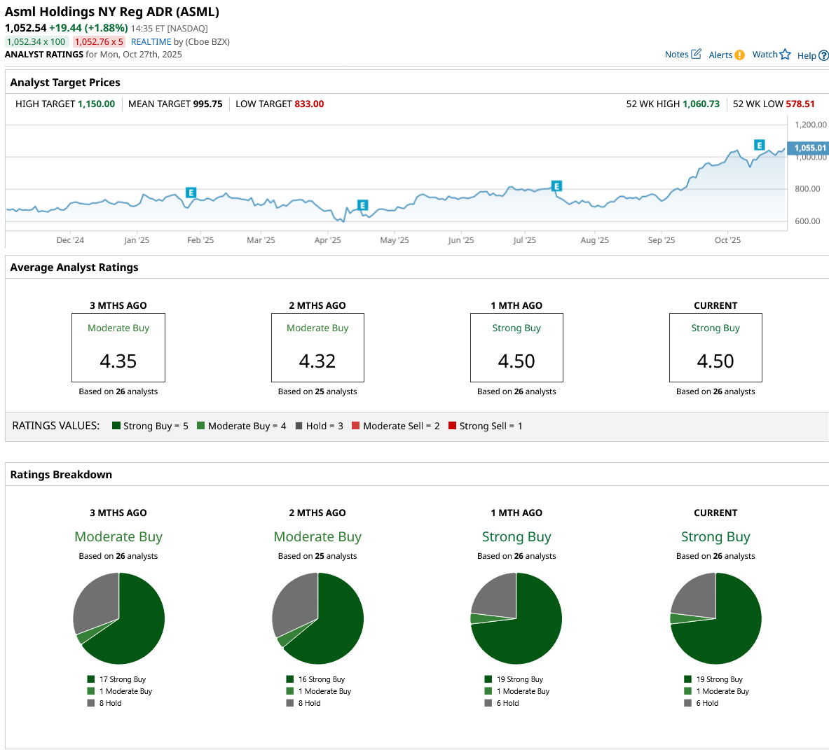 On Wall Street, analysts have given ASML stock a consensus “Strong Buy” rating. Of the 26 analysts who cover the stock, 19 rate it a "Strong Buy," one says it is a “Moderate Buy,” and six rate it as a “Hold.”