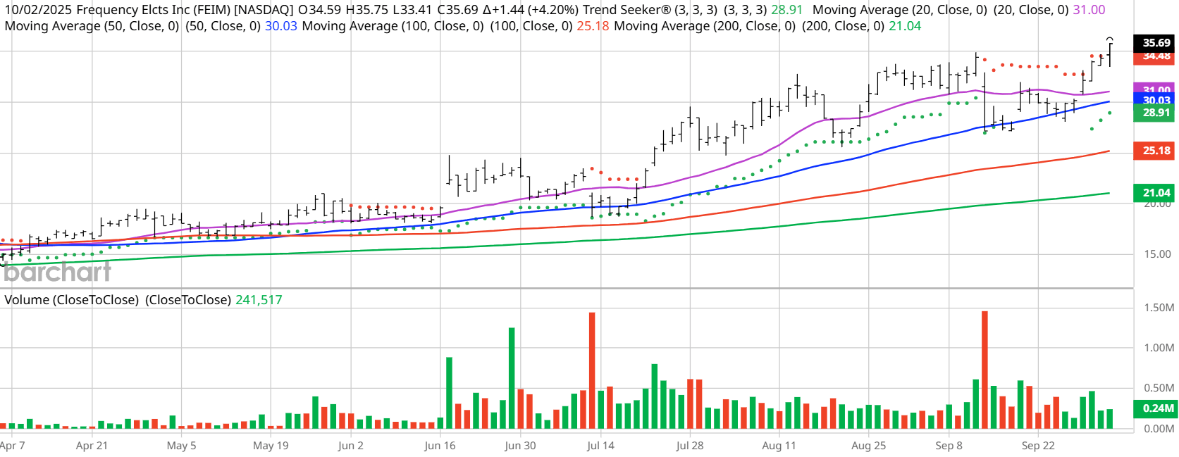 I found today’s Chart of the Day by using Barchart’s powerful screening functions to sort for stocks with the highest technical buy signals; superior current momentum in both strength and direction; and a Trend Seeker “buy” signal. I then used Barchart’s Flipcharts feature to review the charts for consistent price appreciation. FEIM checks those boxes. The Trend Seeker signaled a new “Buy” on Oct. 2.