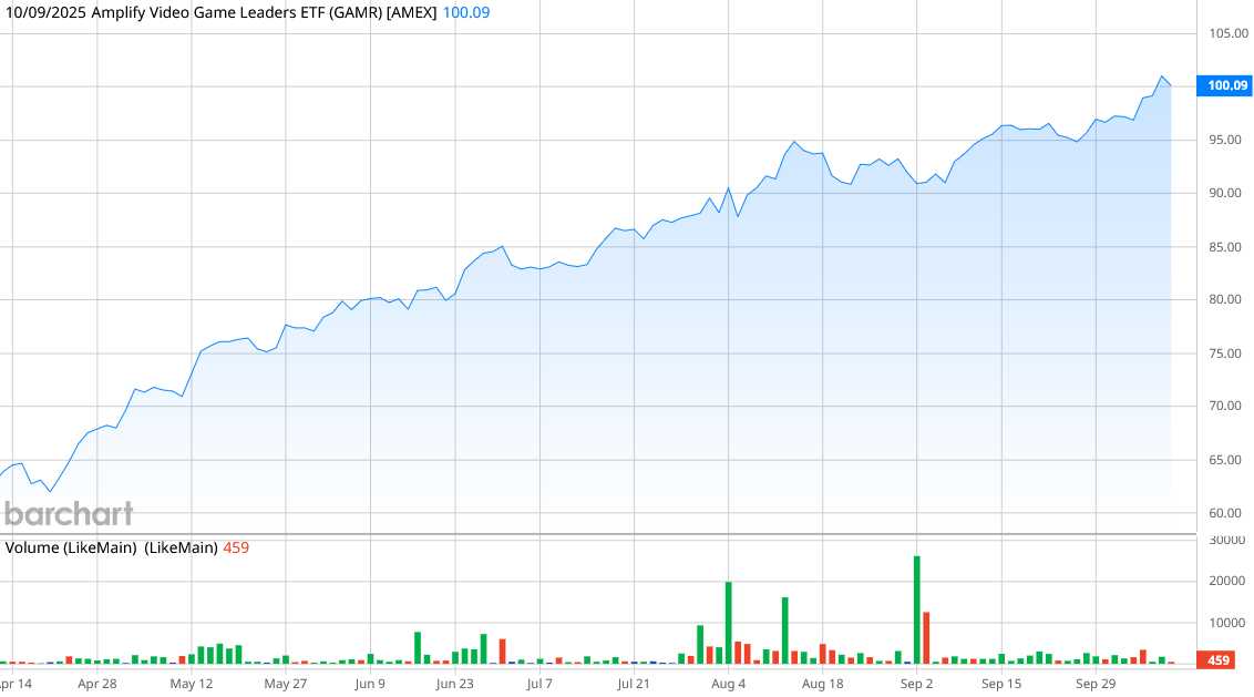 Shares of the GAMR ETF are up 51% so far in 2025, by far outperforming the S&P 500’s ($SPX) 15% gain. If you had invested in GAMR, you would actually have better year-to-date (YTD) returns than with Nvidia (up 38%), but not as much as with AMD (up 75%, thanks to its 30% run this week). The ETF has a net asset value of $99.43, which means shares are currently at a slight discount.