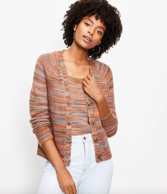 This “spacedye” pattern seems so relevant again all of the sudden, and it’s popping in the most welcome places possible such as this cardigan. Pair it with the matching tank and fresh white jeans as modeled, or try with a complementary color and slacks to dress it up for the office.