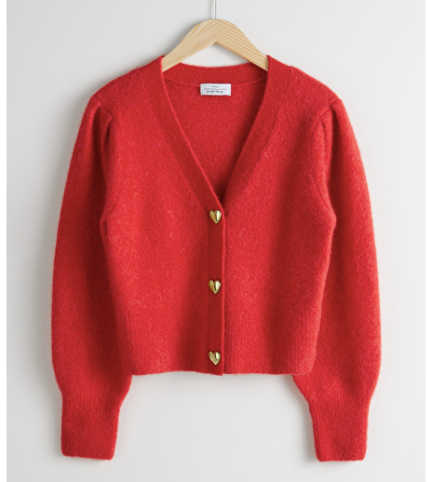 A bold red cardigan adds an element of flirtation to otherwise stern looks, or it can be the icing on the precious cupcake when paired with something ruffly, maybe even a pink tulle skirt. The best part, though, is those adorable heart-shaped buttons.