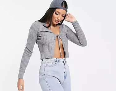 Missguided Tall tie front rib cardigan in gray