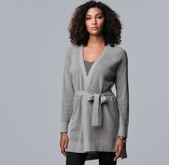 Fancy a belted wrap cardigan? Let design legend Vera Wang’s Simply Vera line take care of you with this sensuous beauty.