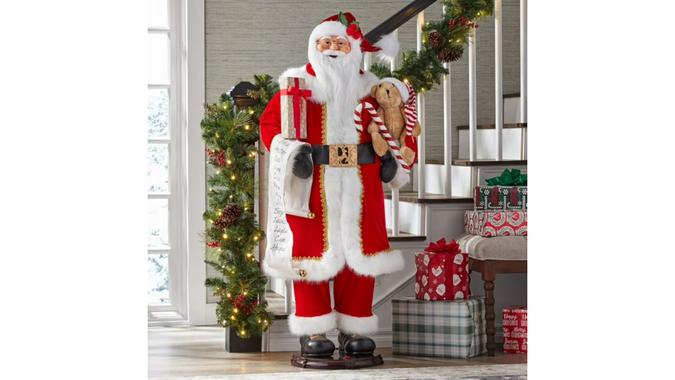 This life-size, 5-foot animated singing Santa is the perfect way to bring the joy of Christmas into your home. He’s dressed in a red coat, a matching hat and a black belt, and holds a candy cane, a stuffed bear and a wrapped gift. Press the red button and watch St. Nick check his list and sing traditional holiday songs, delighting family and guests.