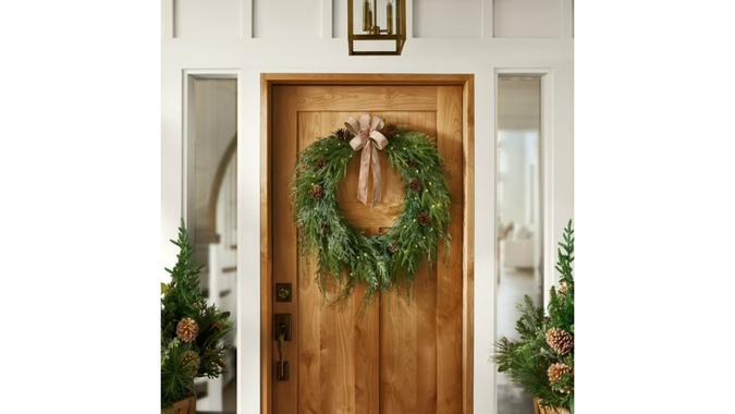 Welcome your holiday guests with the pre-lit natural cypress wreath with pine cones. It features cypress greenery that appears authentic. When twilight comes, watch as the 60 warm white LED lights emit a soft glow. The wreath is 32 inches and includes three AA batteries.