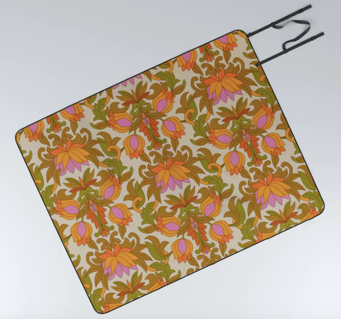 Orange, Pink Flowers and Green Leaves 1960s Retro Vintage Pattern Picnic Blanket