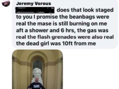 Vorous also implicated himself in various Facebook comments. In one, he wrote “We will take what we want,” sharing an image of him posting with a statue inside. In another comment, he attached a photo with yet another statue, writing “does that look staged to you I promise the beanbags were real the base is still burning on me aft a shower and 5 hrs, [sic] the gas was real the flash grenades were also real the dead girl was 10ft [sic] from me.”