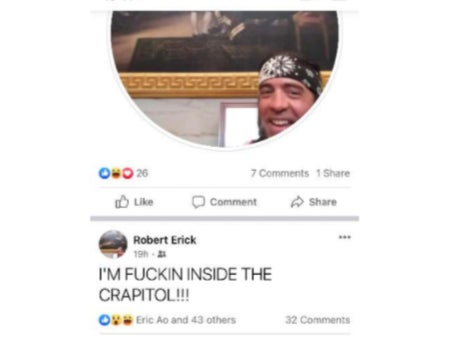 “Also did online interview with Jess Brevins of the WSJ,” he continued. “We are not a match,” the match said in reply, before sending a screenshot to law enforcement. Authorities later uncovered Chapman’s Facebook account, under the name of “Robert Erick.” On Jan. 8th, he posted, “I’M F**IN INSIDE THE CRAPITOL!!!”