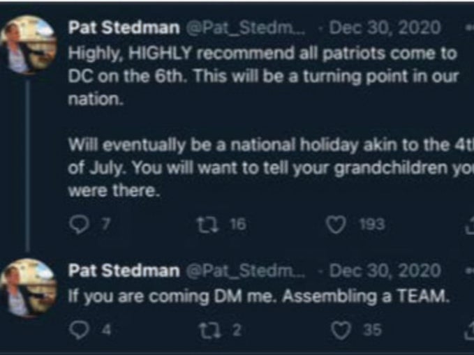 Indeed, screenshots from Stedman’s Twitter posted December 30, 2020, say, “Highly, HIGHLY recommend all patriots come to DC on the 6th. This will be a turning point in our nation. Will eventually be a national holiday akin to the 4th of July. You will want to tell your grandchildren you were there.”