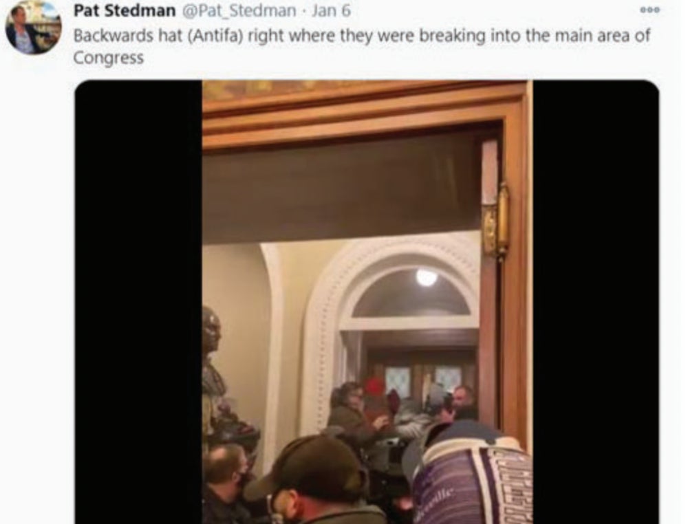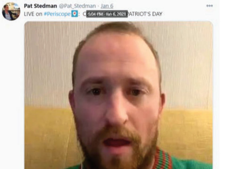 Pat Stedman told on himself via Twitter. On Jan. 6, Stedman posted a video, blatantly discussing his participation in the riots: “I was pretty much in the first wave, and we broke down the doors and climbed up the back part of the Capitol building, and got all the way into the chambers,” he said. He posted several live videos from the scene, as well.