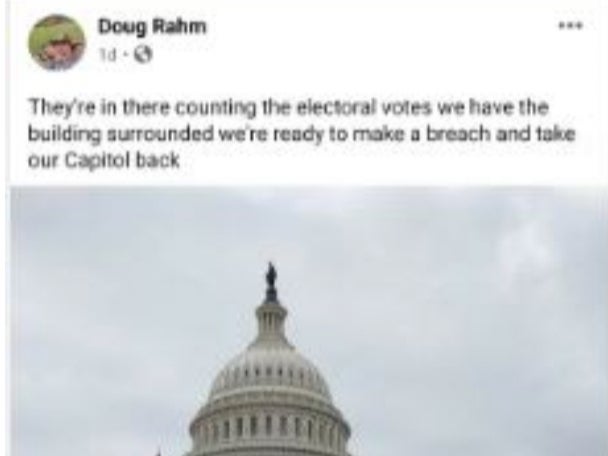 Rahm had initially posted an image of the Capitol building, writing, “They’re in there counting the electoral votes we have the building surrounded we’re ready to make a breach and take our Capitol back.” It was quickly deleted, but a friend managed to capture a screen grab.
