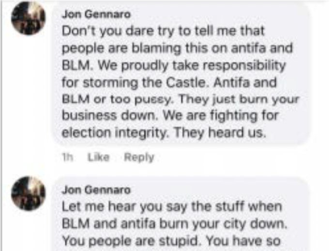 In a follow up comment, Jon wrote, “Don’t you dare try to tell me that people are blaming this on Antifa and BLM. We proudly take responsibility for storming the Castle.”