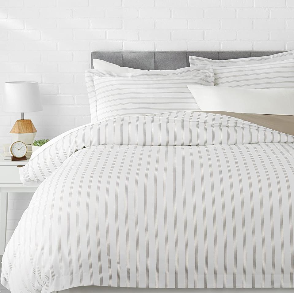 This breathable bedding set from Amazon’s own Basics line includes two pillow shams as well as the duvet cover. Solid hues are available, and you can also choose from bright, bold patterns as well as understated stripes. But it’s the microfiber fabric that’s ultra-soft and ultra-durable—standing up to repeated washings—that’s garnered more than 35,000 ratings on Amazon.