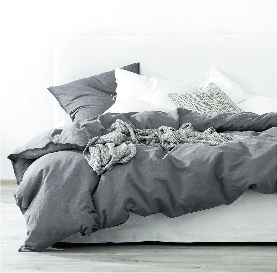 Get the durability and luxury of linen with the breathability and—let’s be honest—affordability of cotton with Bedsure’s linen duvet set. The duvet cover attaches with the standard internal ties, but it’s the coconut button closures that add an unexpectedly stylish touch. And while the manufacturer doesn’t recommend a dryer, reviewers said they tumble dried it on low and had no issues with wrinkling.