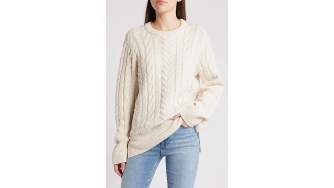 This timeless cream women’s sweater is cable stitched with wool and cashmere yarns, making it a cozy investment piece. You’ll wear it with care for many winters to come.