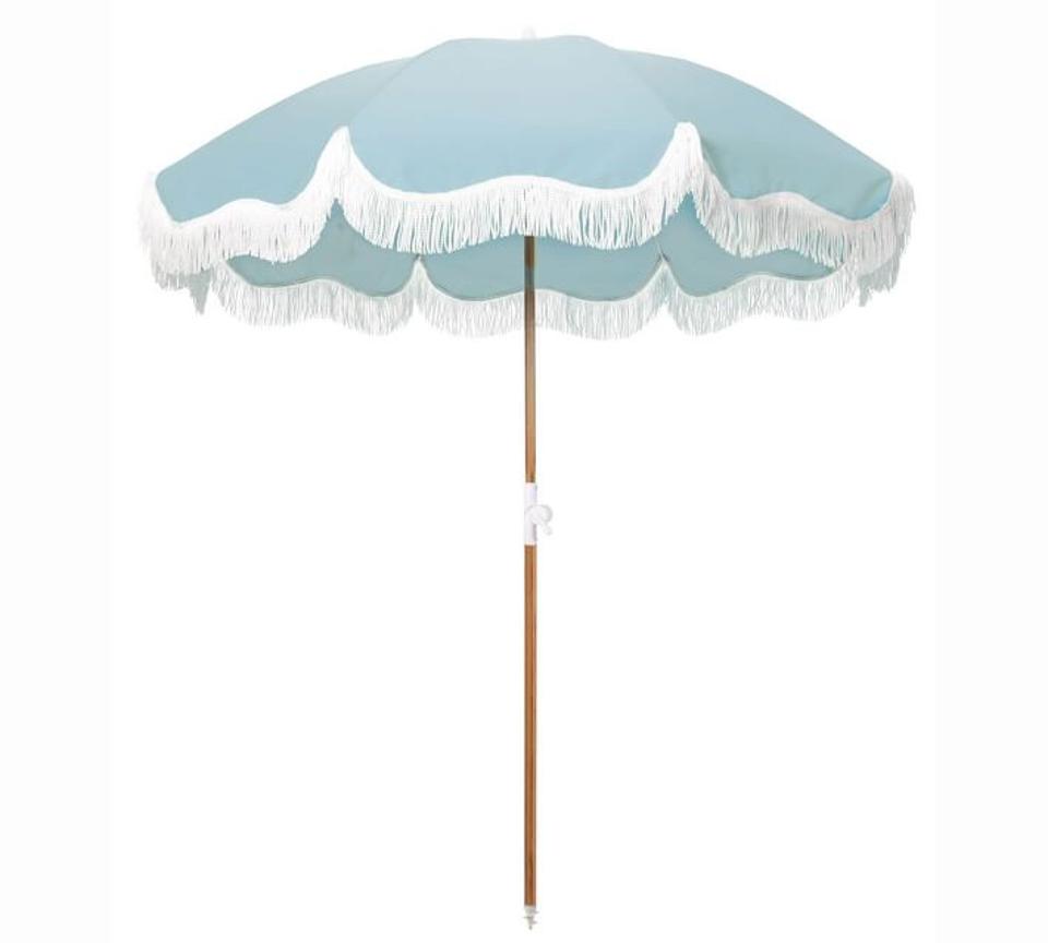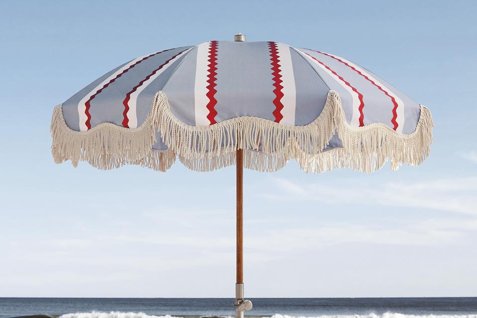 There are plenty of beach umbrellas out there that blend into the crowd. This stylish Serena & Lily option is not one of them. Its pretty pattern—choose between Beach Club Coastal Blue (pictured) and Gingham Coastal Blue—a reclaimed timber pole and fun tassel fringe trim make it an elevated option that really stands out. It also has a screw base to easily anchor it in the sand, and an easy-to-maneuver joint for angling with the sun. Plus, it comes with a matching carry bag to allow you to move it from the beach to your home.