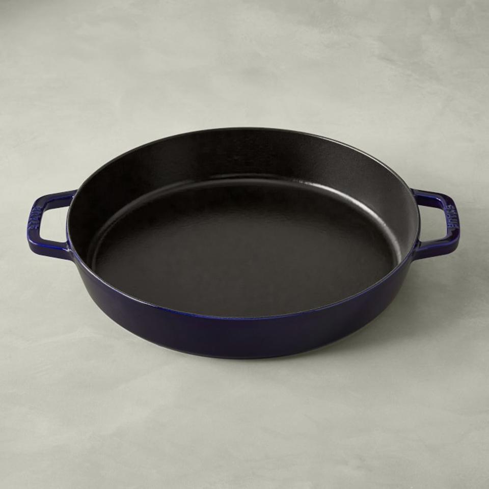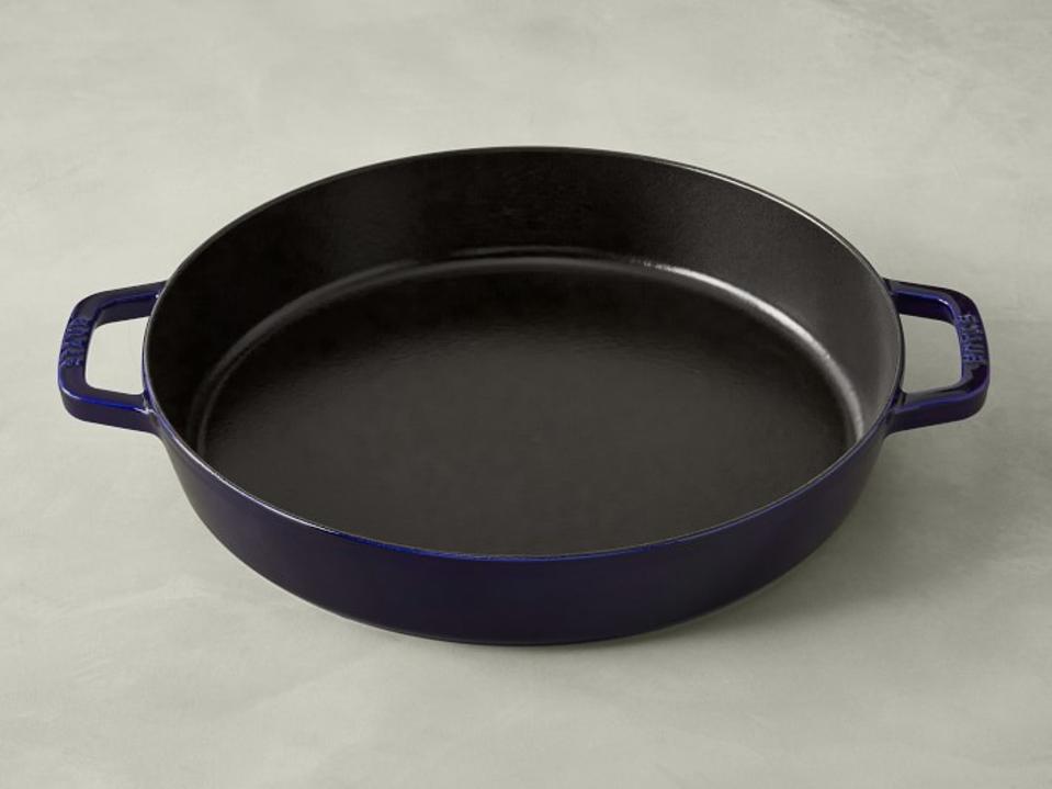 If you frequently serve food right out of the pan, the Staub Double-Handle Skillet makes it easier to transport the hot cookware from oven to table. This 13-inch skillet, which comes in five colors, would be the perfect pan for deep-dish pizza or party dip, and its enameled interior doesn’t require seasoning. Its two loop side handles give you a better grip when moving the skillet and also make it easier to store.