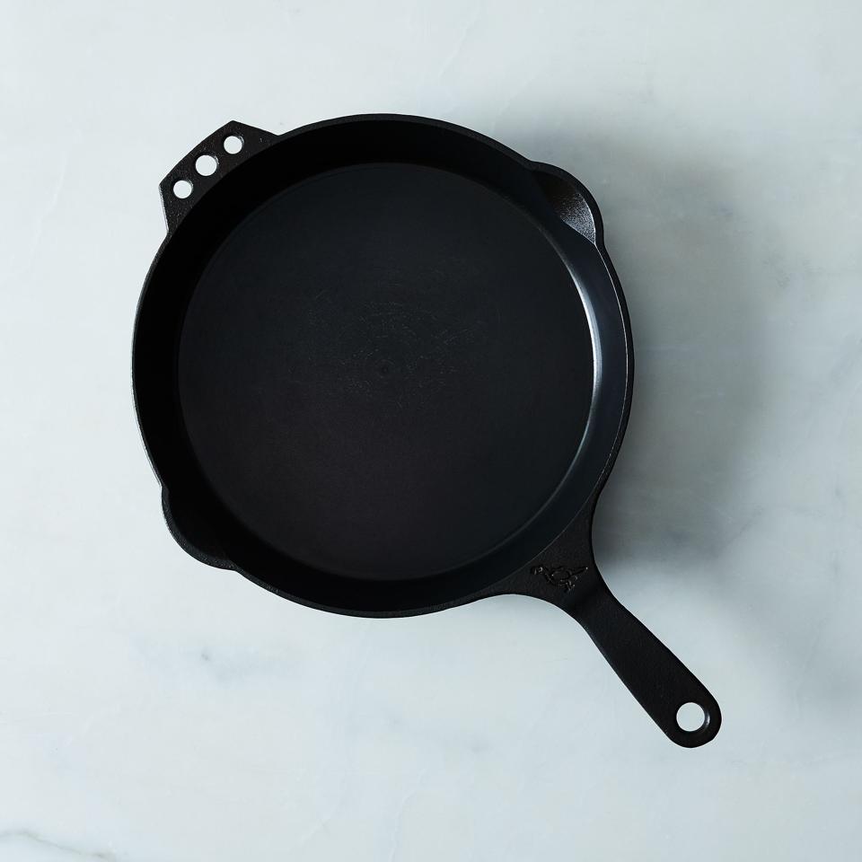 Many cast iron skillets have a rough, pebbly surface, but the Smithey No. 10 Cast Iron Skillet has a satin-smooth polished finish that’s a dream to cook on. Crafted by hand and surprisingly lightweight (just over five pounds), this 10-inch pan features pour spouts on both sides and ergonomic handles with convenient holes for hanging.