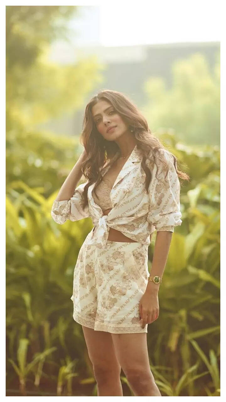 Malavika is looking stellar in a bralette and printed shirt with denim shorts.