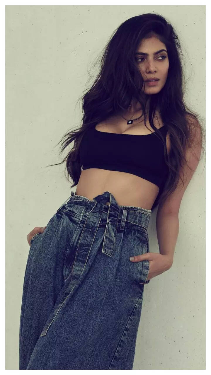Malavika flaunts her curvaceous figure in a black blouse and denim trousers.
