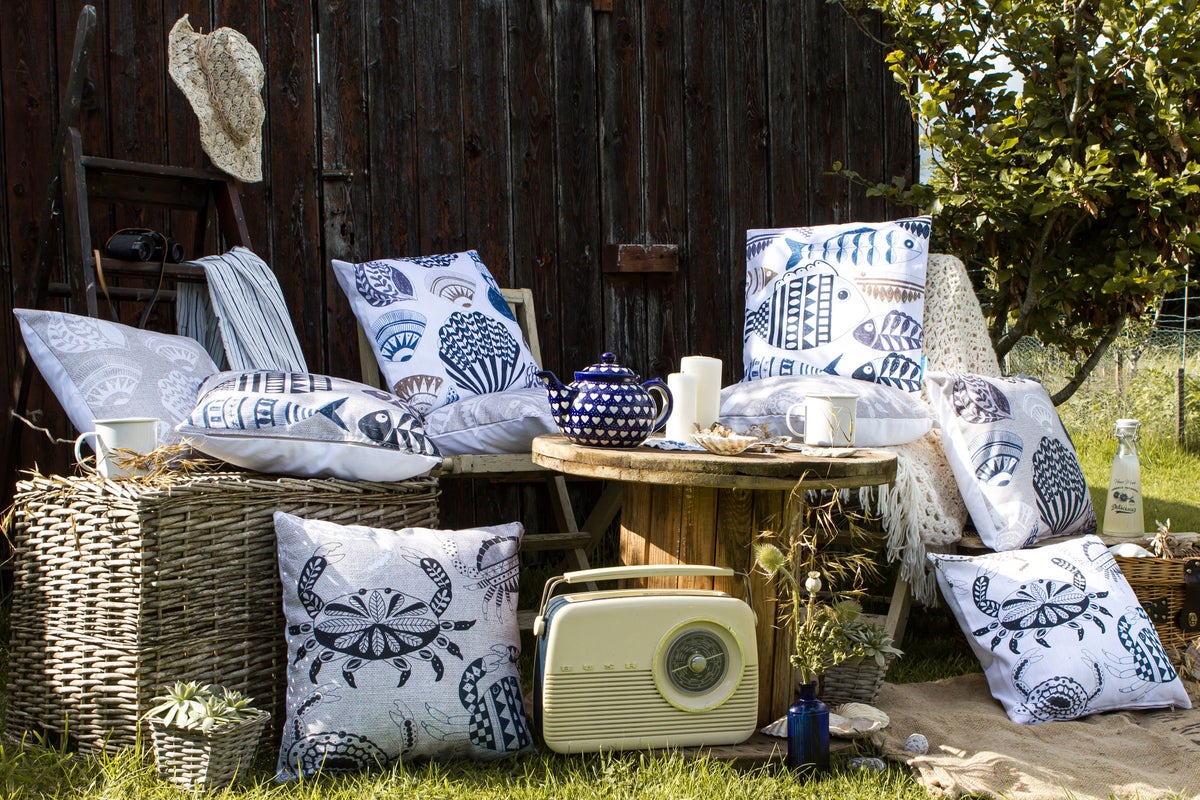 10. Scraffito Outdoor Cushion Collection: Crab On White Outdoor Cushion, from £49.99, Fish On White Outdoor Cushion, from £49.99, rest of items from a selection, Perkins & Morley
